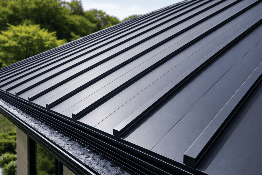 ガルバリウム鋼板製の縦葺き屋根で、継ぎ目が少なく防水性が高いのが特徴です。