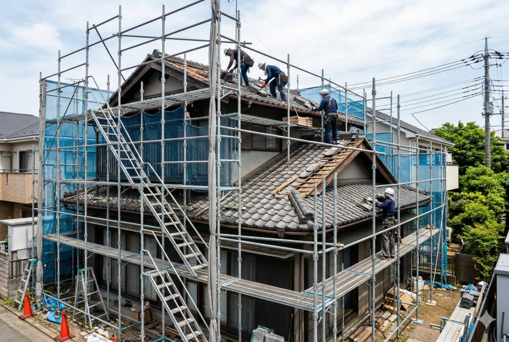 屋根工事の葺き替えは屋根材をすべて撤去・交換するため、高所での長時間作業が伴います。